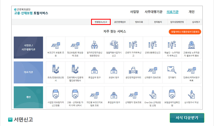 민원신고 -> 사업자 업무 -> 두루누리 보험료 지원을 들어갑니다.