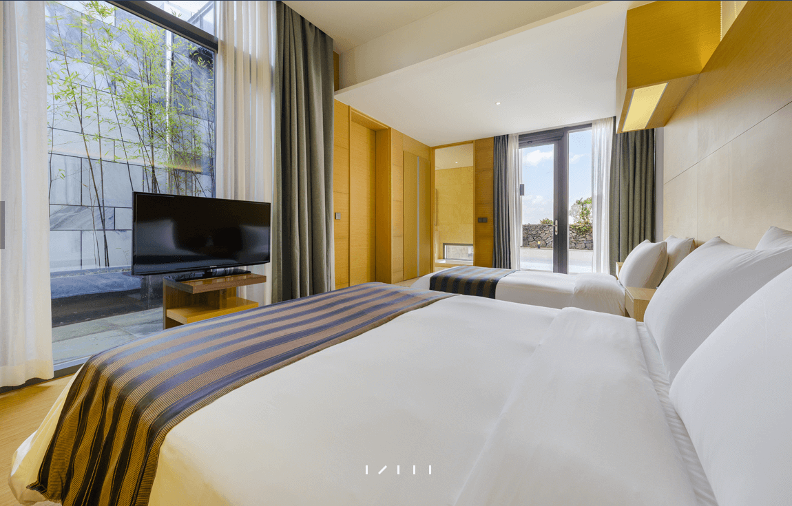숙소는 스탠다드 트윈, 프리미엄 더블, 딜럭스 트윈, 스위트룸, 그리고 빌라 타입으로 구성되어 있습니다. 스탠다드 트윈은 최대 4명, 프리미엄 더블은 최대 3명, 딜럭스 트윈은 최대 4명, 스위트룸은 최대 6명까지 수용가능합니다. 또한 최대 6명까지 수용 가능하고 제주의 풍광을 즐길 수 있는 프라이빗 스위트 풀빌라도 객실인 오빌라, 에스빌라도 운영되고 있어 가족 단위로 방문하시는 분들께 특히 추천드립니다.