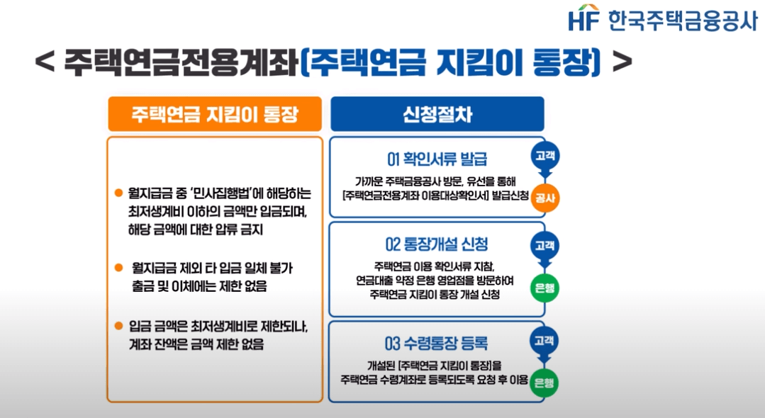 또한 연금을 계속 지급하기 위해 필요한 경우 공사는 담보 설정 금액에 상향을 요청할 수도 있습니다. 가입자가 연금을 안정적으로 지급받을 수 있도록 월 185만 원 이하의 금액에 대해서는 압류가 금지되는 주택연금 전용계좌를 이용하실 수도 있습니다. 주택연금 전용계좌를 신청하시려면 가까운 한국주택금융공사 지사로 방문하시거나 전화로 이용신청을 하시고, 필요한 서류를 지참하신 뒤 연금을 받으실 때 방문하셨던 은행지점에 방문해 신청하시면 됩니다.