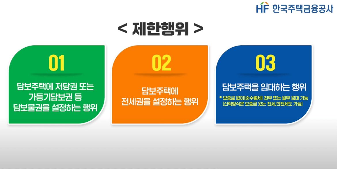 주택연금을 받으려면 근저당권 설정 또는 신탁등기의 방법으로 공사에 담보를 제공해야 합니다. 평생연금을 지급하기 위해서는 안정적인 담보가 바탕이 되어야 하므로 주택연금을 받는 중 주택을 다른 곳에 담보로 제공하거나 그밖에 공사의 담보를 침해하는 행위를 할 수 없습니다. 이를 위해 저당권 방식의 경우에는 담보주택의 다음과 같은 부기등기를 해야 합니다.
