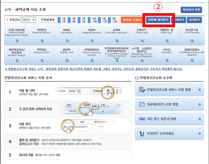 근로자 개인의 경우는 일괄제공 신청확인, 간소화 자료 확인, 공제 증명자료 수집, 공제 신고서 제출 등의 순서로 진행됩니다. 연말정산 신고 누락 시에는 5월에 종합소득세 신고를 해야 합니다.