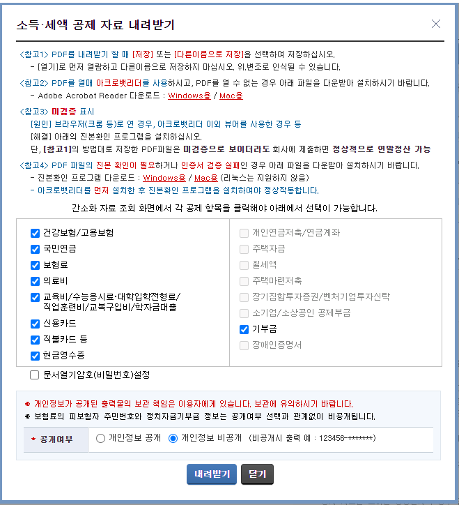 - 내용 : 국세청 간소화 서비스에서 소득공제 세액공제 증명자료 등을 확인